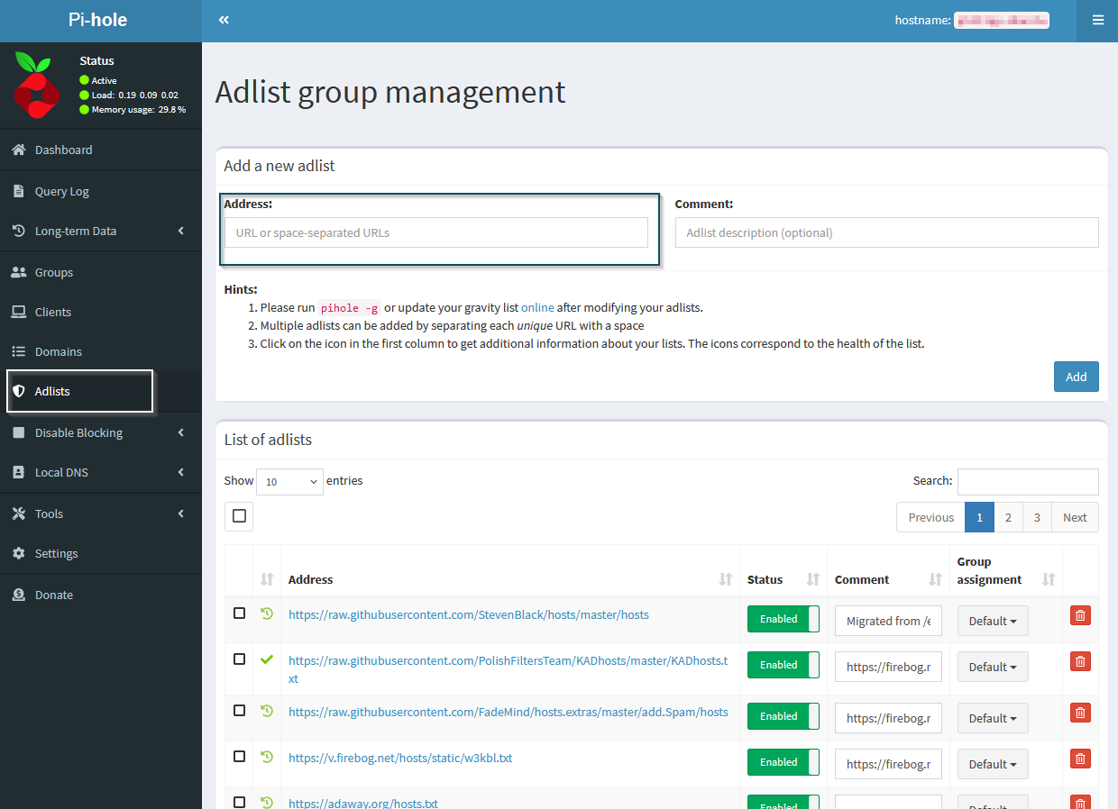 - Füge die URLs der Listen ein und aktualisiere die Gravity-Datenbank (Pi-Hole zieht sich dann alle neuen Einträge).