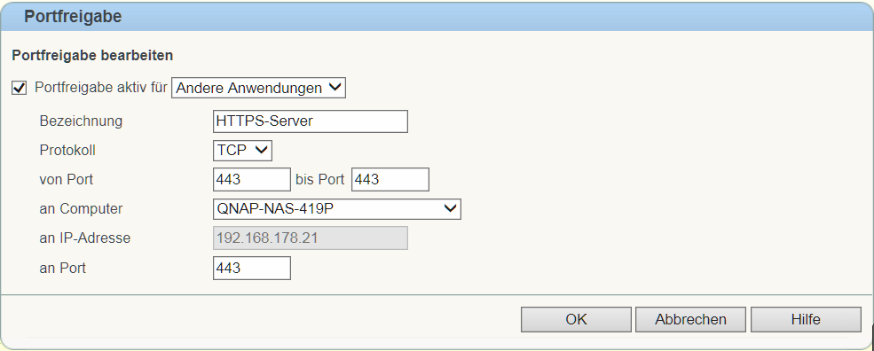 - "an Port" bezeichnet an welchen Port die Anfrage weiter geleitet werden soll, in unserem Fall auch Port 443, die https- Verbindung (80 für http).